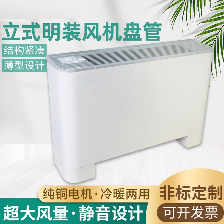 立式明裝風機盤具有管效率高,能量足,風量大,噪音低,安全可靠,壽命長的優點,是明裝風機盤管。