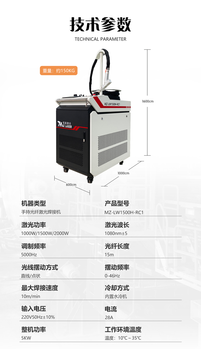 手持式光纖激光焊接機MZ-1000/2000W-RC,采用全新一代光纖北京熱刺/武漢銳科激光器,配置超強擺動焊槍,漢利冷水機。具有操作簡單、焊縫美觀、焊接速度快、無耗材的優(yōu)勢。填補激光設(shè)備行業(yè)手持式焊接的空白。