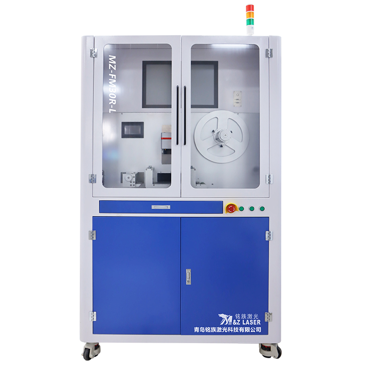 MZ-FM30-RL是一款全自動3M標簽激光打標機,其工作臺上安裝全自動放卷送料系統,人工將一卷標簽紙安裝好后并將整卷標簽紙送入導向板后壓緊,人工啟動打標開關,標簽紙自動走到打標位置真空吸附平整觸發激光打標,標簽紙打標完成,標簽紙運動到切紙位置,切紙機構壓緊標簽紙,自動切紙后退回到原位,切紙機構松開標簽紙,標簽紙掉落到接料盒收納,打標機進行下一張標簽紙打標循環,整卷紙根據人工或者MES系統給的任務單完成打標后人工取出。
