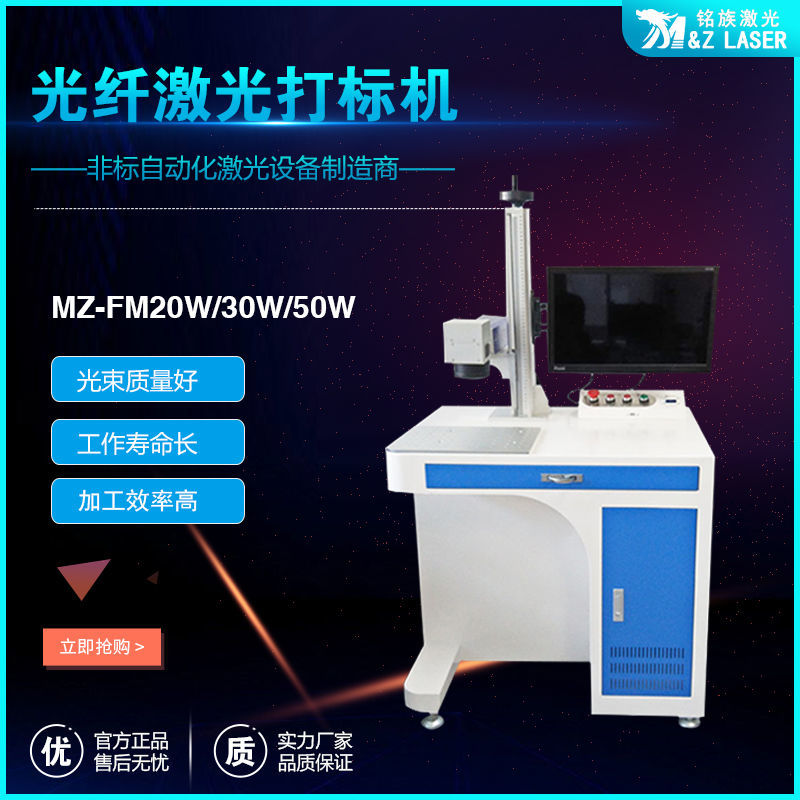MZ-FM-20/30/50/100W-R光纖激光打標機是我公司運用現今世界上先進的激光技術研制而成的新一代激光打標機系統。采用武漢銳光纖輸出激光,再經高速掃描振鏡系統實現打標功能。光纖激光打標機電光轉換效率高,達到30%以上,采用風冷方式冷卻,整機體積小巧,輸出光束質量好,可靠性高??傻窨探饘俨牧虾筒糠址墙饘俨牧希饕獞糜趯ι疃取⒐饣?、精細度要求較高的領域,如鐘表、首飾、模具行業,位圖打標等。
